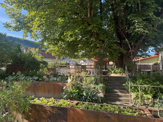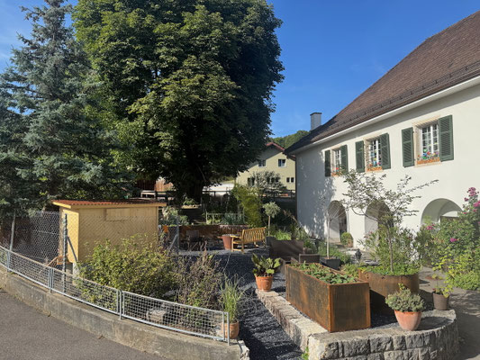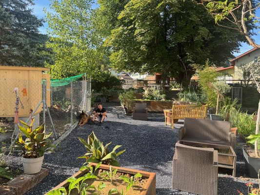 Im Frühjahr 2025 erfolgte eine weitere Sanierungsetappe. Ziel war es, den ganzen Garten nun auch Rollstuhl- und Rollator-tauglich zu gestalten. Dazu musste die Mauer durchbrochen und ein neuer Bodenbelag eingesetzt werden. Auch die ins Alter gekommenen Holz-Hochbeete wurden durch 9 aus Corten-Stahl bestehende Hochbeete ersetzt. Ebenso wurde auch die Feuerstelle vollständig erneuert. Neue Sitzbänke und eine Neubepflanzung haben die Gartenanlage deutlich aufgewertet. Ein Gehege mit Hühnerstall bietet nun Platz für 4 Seidenhühner und einen Güggel.